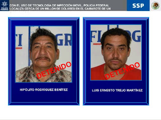 Posteriormente a los tripulantes de la unidad, quienes se identificaron como Hipólito Rodríguez Benítez y Luis Ernesto Trejo Martínez se les solicitó la documentación correspondiente al legal traslado y procedencia de dicho dinero, el cual no pudieron acreditar, por lo que fueron detenidos.